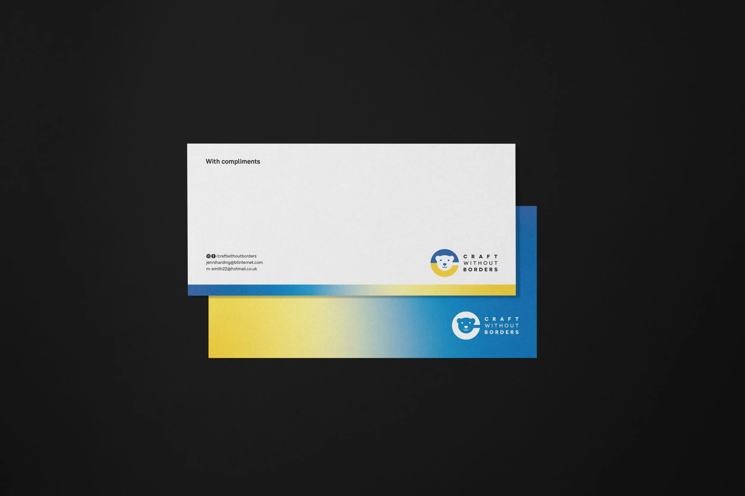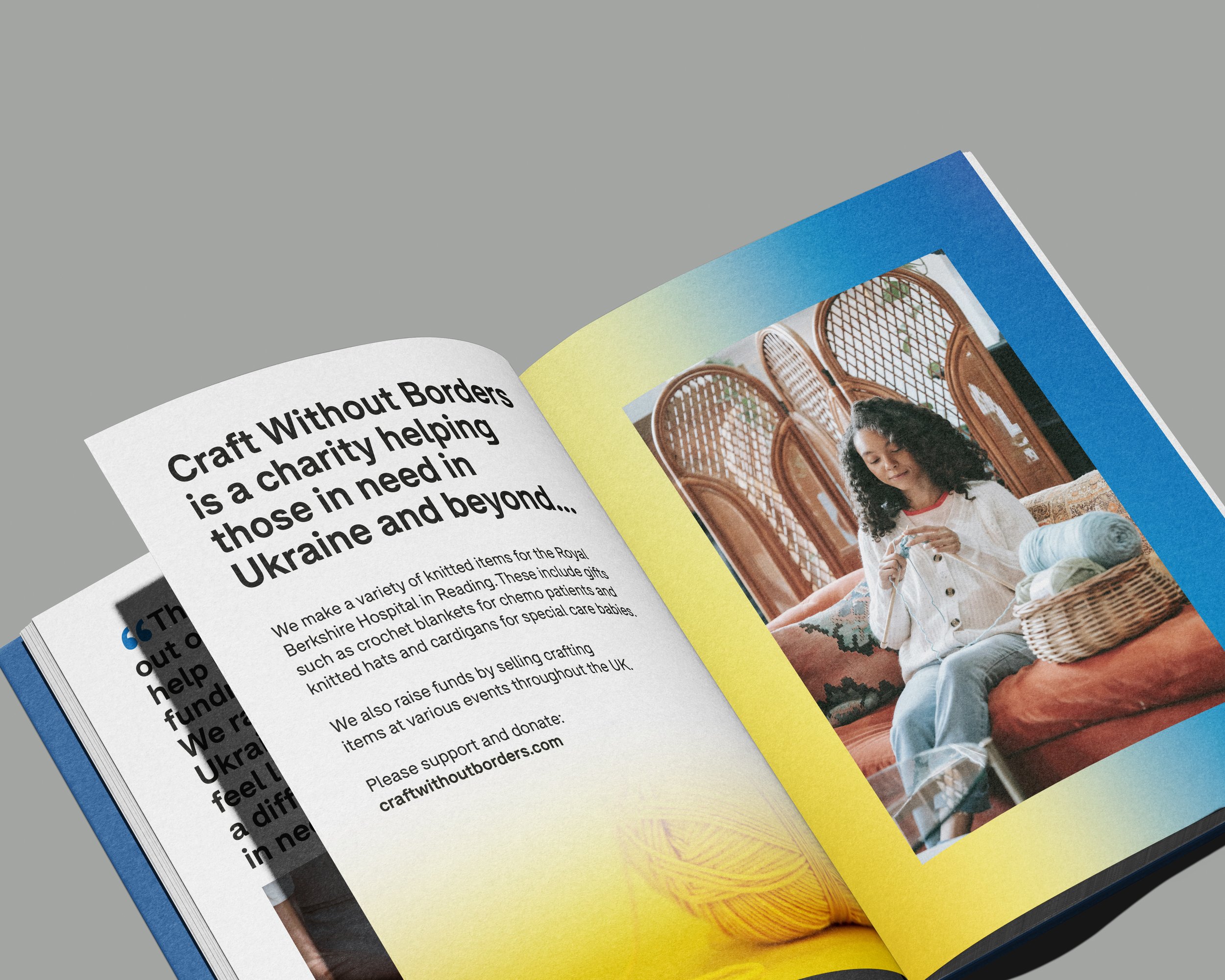 Brand Identity for Craft Without Boarders, a charity, which make a variety of knitted items for the Royal Berkshire Hospital in Reading to raise money for the war in Ukraine. These include gifts such as crochet blankets for chemo patients and knitted hats and cardigans for special care babies. A variety of ideas were presented to the client, but they favoured using a bold sans-serif ‘C’ for craft, split in half for blue and yellow, the colours of the Ukraine flag. Using the negative space of the letter c, sits the teddy bear, which is the most sold knitted item to raise funds for those affected by the war. The logotype works in a landscape, stacked and icon versions, in full colour and monotone, across a variety of print and digital platforms, including leaflets, brochures, and stationery.