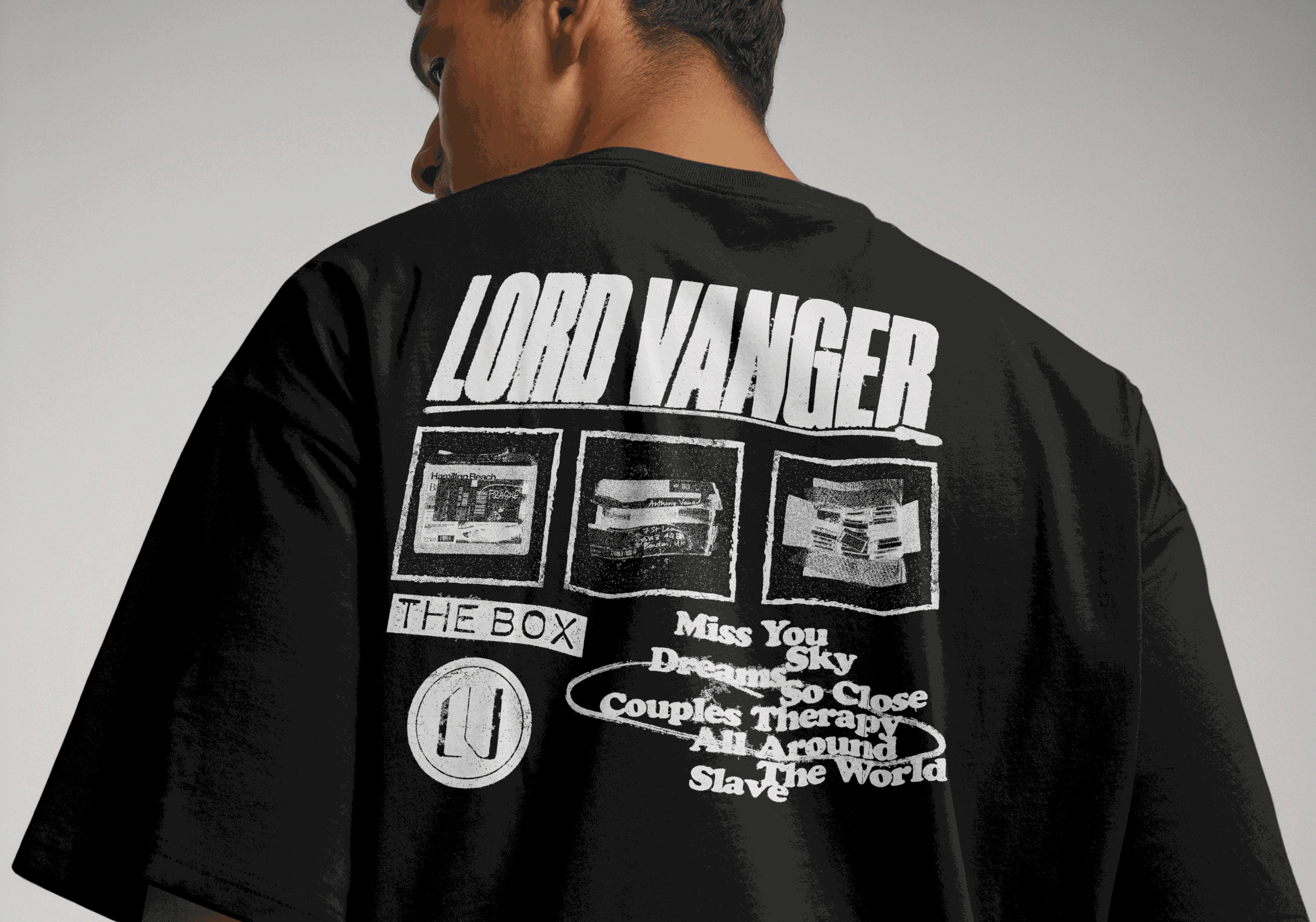 Unisex long sleeve and short sleeve apparel design for Lord Vanger’s forthcoming album, ‘The Box’, inspired by the typography on the storage box, old labels, DAT and VHS video tapes, vintages 70s typefaces with a worn effect.